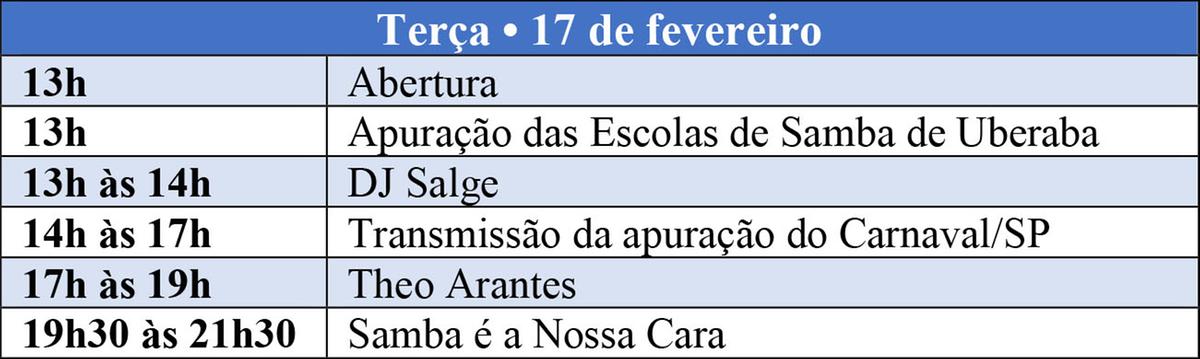 A programação oficial desta terça-feira prevê: 13h – abertura e apuração das escolas da Liga Uberabense; 13h às 14h – DJ Salge; 14h às 17h – transmissão da apuração dos votos do Carnaval de São Paulo; 17h às 19h – Theo Arantes; e 19h30 às 21h30 – Samba é a Nossa Cara.