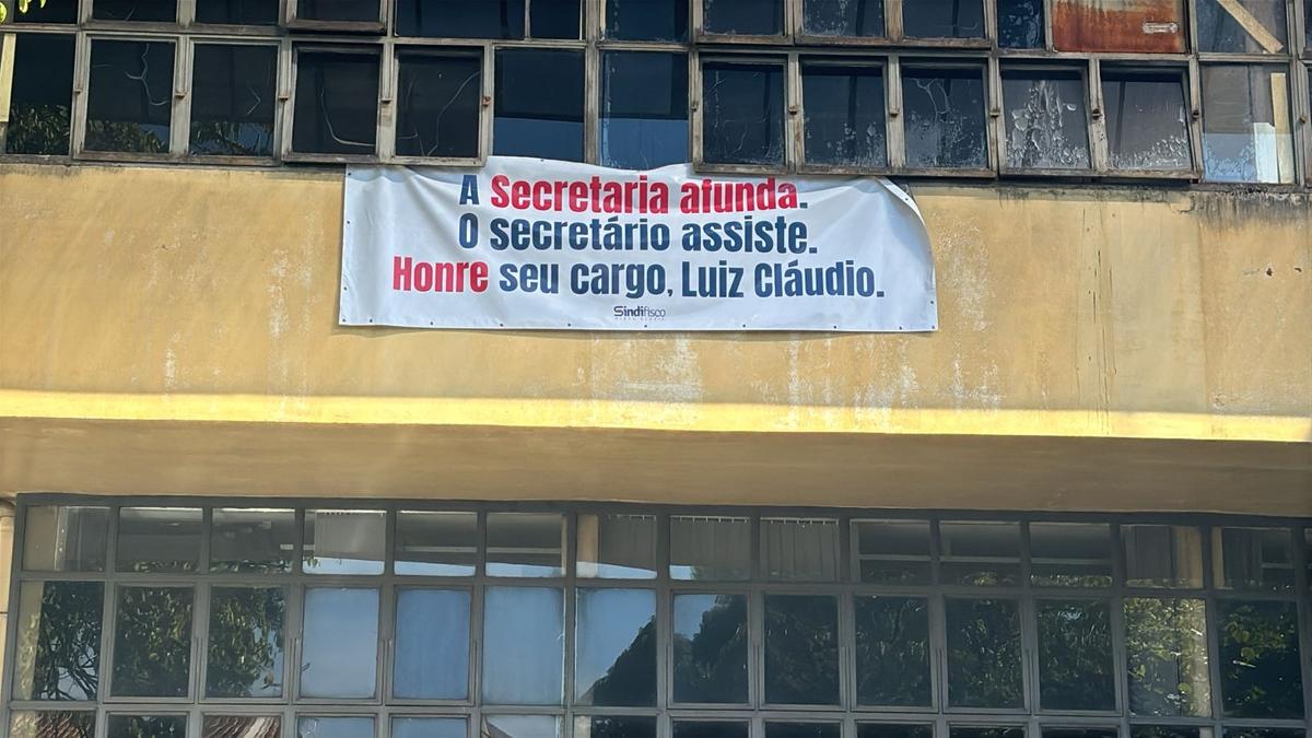 Faixas e cartazes criticam secretário Luiz Cláudio Gomes; categoria aponta desmonte da estrutura fiscal e risco para arrecadação do Estado