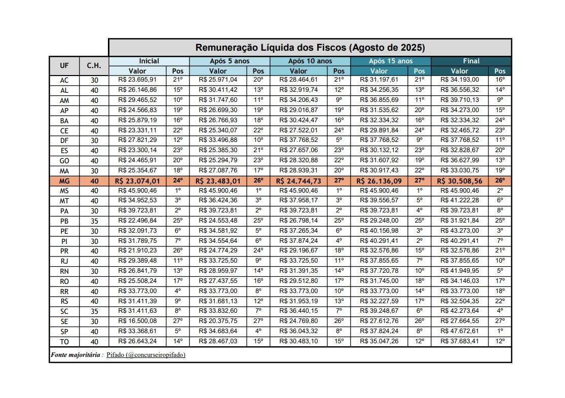 Os dados de remuneração líquida dos fiscos estaduais, referentes a agosto de 2025, indicam que Minas Gerais ocupa a 26ª colocação nacional, atrás de estados com arrecadação significativamente menor.