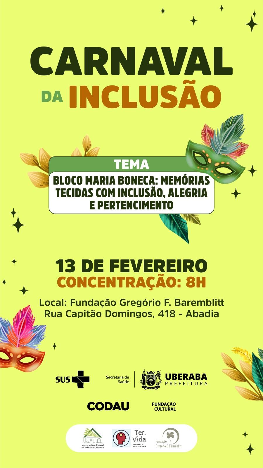 O Bloco Maria Boneca, formado por integrantes da Rede de Atenção Psicossocial de Uberaba, abre oficialmente o Carnaval em Tom Maior na Terra de Gigantes 2026 nesta sexta-feira (13), a partir das 8h.