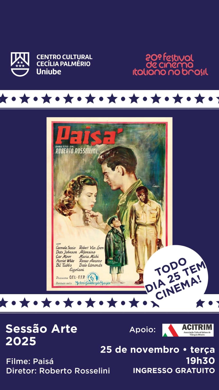 Uberaba recebe nesta terça-feira (25), às 19h30, a exibição gratuita do filme Paisà (1946), de Roberto Rossellini, um dos marcos do neorrealismo italiano. A sessão faz parte do Festival de Cinema Italiano no Brasil, iniciativa que desde 2005 promove a circulação de produções clássicas e contemporâneas no país, aproximando o público brasileiro da cultura cinematográfica da Itália. A entrada e o estacionamento são gratuitos.