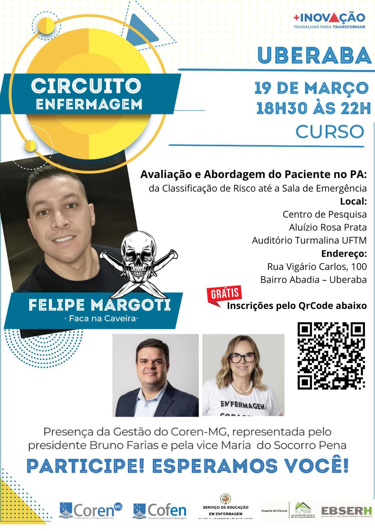 Entre os destaques da programação está a participação de Felipe Margoti, com a abordagem “Faca na Caveira”. O evento também contará com representantes do Conselho Regional de Enfermagem de Minas Gerais (Coren-MG), incluindo o presidente Bruno Farias e a vice-presidente Maria do Socorro Pena.