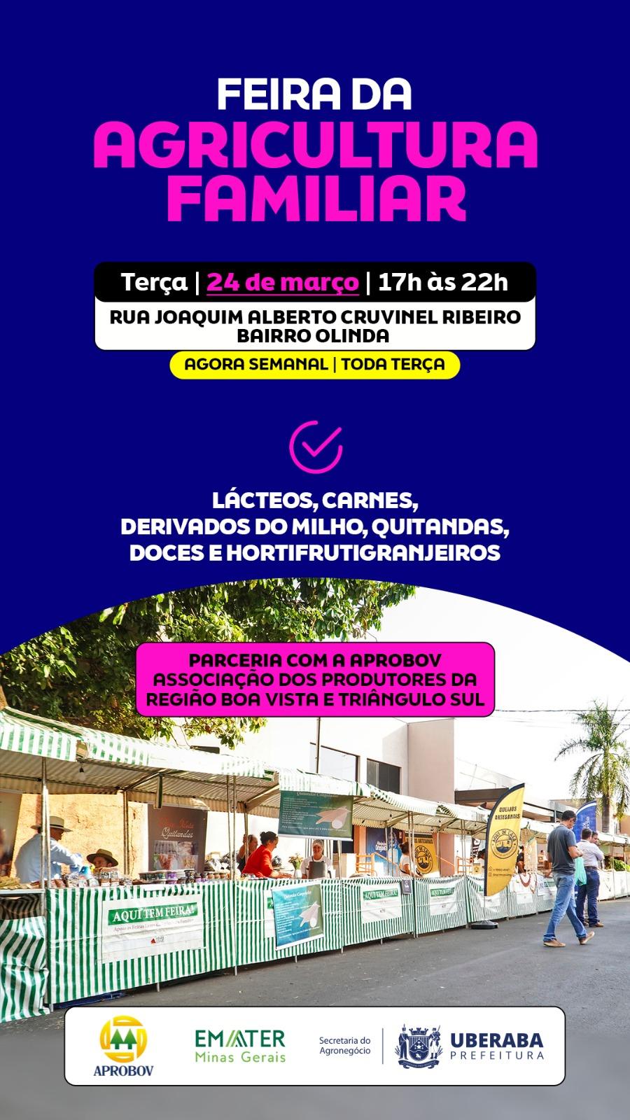 No mesmo dia, o bairro Olinda recebe a feira das 16h às 22h, na Rua Joaquim Alberto Cruvinel Ribeiro. A ação conta com 16 expositores e parceria com a Associação dos Produtores da Região Boa Vista e Triângulo Sul (Aprobov).