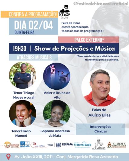 A abertura será realizada na quarta-feira (2), a partir das 19h30, com apresentações musicais em palco aberto. Estão previstos shows com o tenor Thiago Neves e coral, o duo Ádler e Bruno de Vito, o tenor Flávio Manoel e a soprano Andressa da Mata, além de participação especial de Aluízio Elias e intervenções cênicas em homenagem ao legado de Chico Xavier.