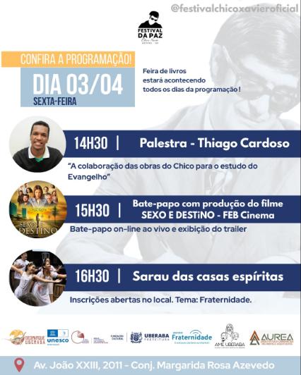 Na sexta-feira (3), a programação segue com palestras e atividades voltadas à reflexão sobre a obra do médium. Às 14h30, Thiago Cardoso aborda a contribuição dos escritos de Chico Xavier para o estudo do Evangelho. Em seguida, às 15h30, haverá bate-papo online com a produção do filme “Sexo e Destino”, com exibição do trailer da adaptação cinematográfica. Às 16h30, o Sarau das Casas Espíritas reúne apresentações culturais com o tema “fraternidade”.