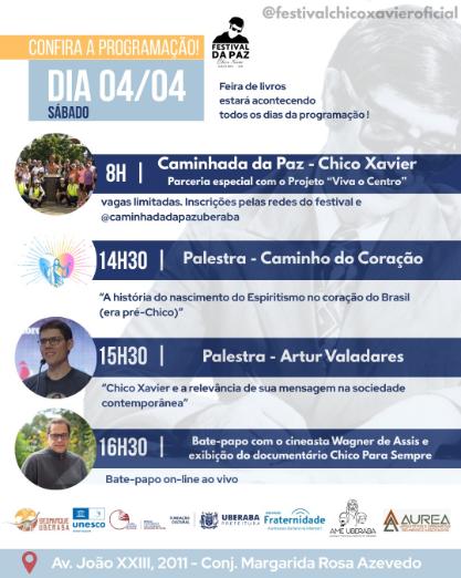 No sábado (4), às 8h, será realizada a Caminhada da Paz – Chico Xavier, com percurso por locais ligados à trajetória do médium. À tarde, a programação inclui palestras como “Caminho do Coração”, às 14h30, e “Chico Xavier e a relevância de sua mensagem na sociedade contemporânea”, com Arthur Valadares, às 15h30. Às 16h30, o público poderá acompanhar um encontro virtual com o cineasta Wagner de Assis, diretor do filme “Nosso Lar”, seguido da exibição do documentário “Chico Para Sempre”.