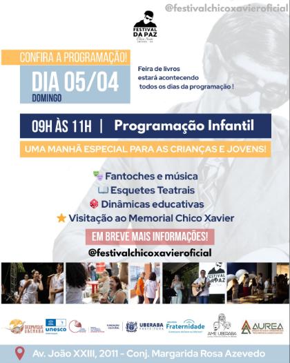 O encerramento, no domingo (5), será voltado ao público infantil, com atividades das 9h às 11h, incluindo apresentações com fantoches, esquetes teatrais e dinâmicas educativas sobre a vida de Chico Xavier.
