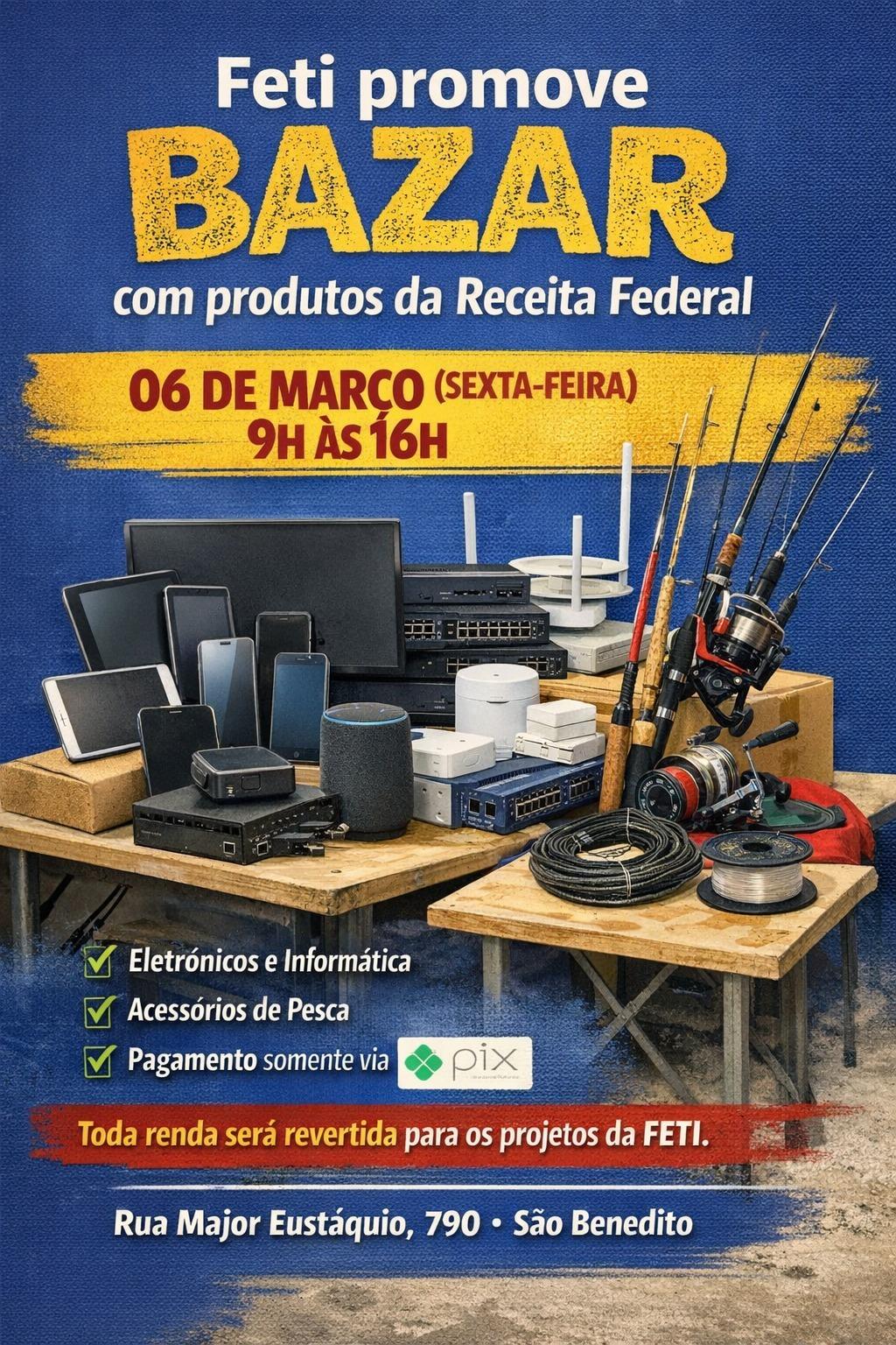 A Fundação de Ensino Técnico Intensivo Dr. Renê Barsam (Feti) promove nesta sexta-feira (6), das 9h às 16h, um bazar solidário com produtos recebidos em doação da Receita Federal do Brasil. A ação é aberta à comunidade.