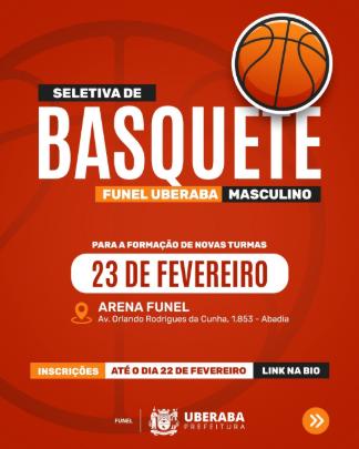 A Fundação Municipal de Esporte e Lazer (Funel) realiza, no dia 23 de fevereiro, uma seletiva de basquete masculino para a formação de novas turmas de rendimento em Uberaba. Os testes serão realizados na Arena Funel e buscam identificar talentos para representar o município em competições oficiais.