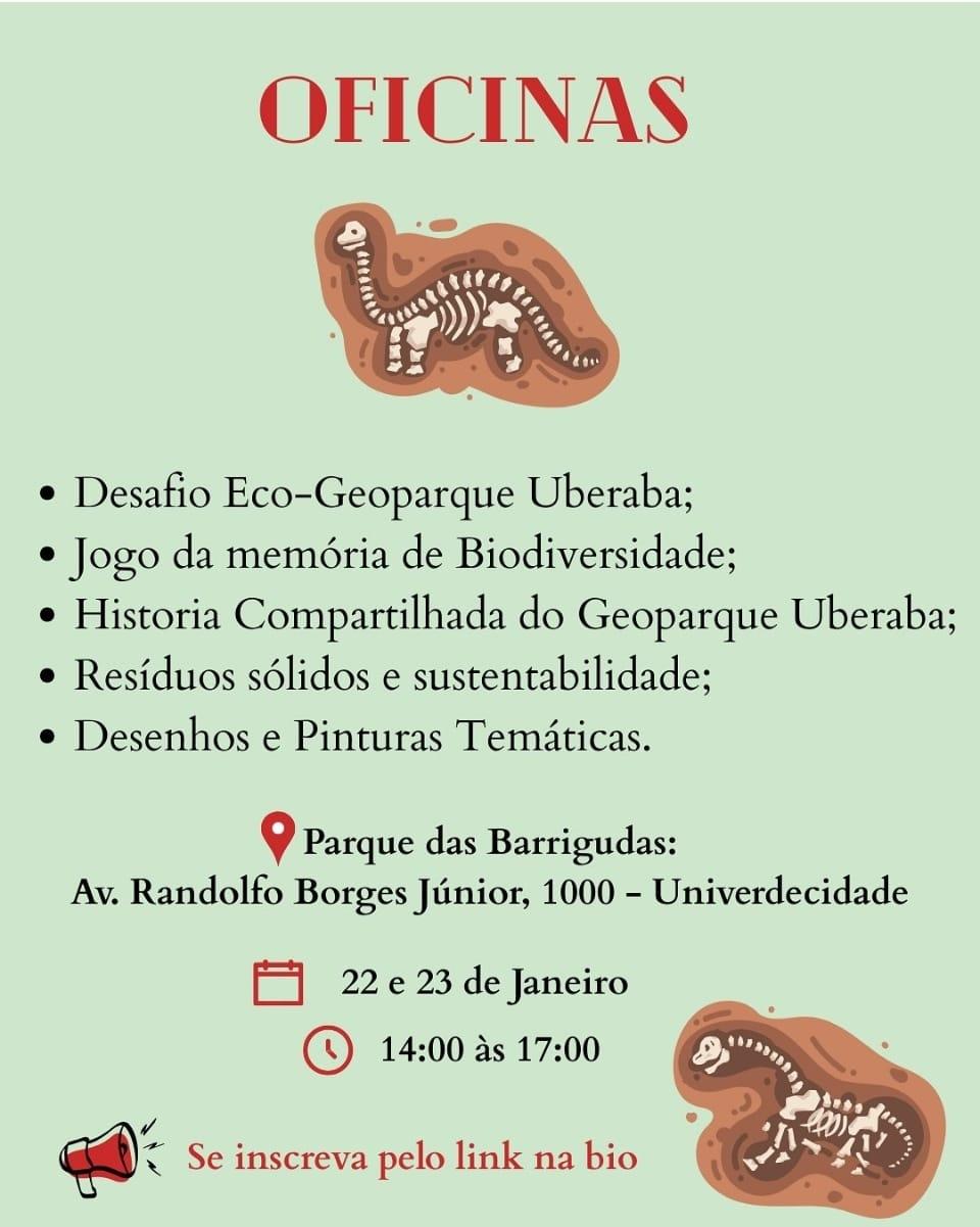O Geoparque Uberaba realizará, nos dias 22 e 23 de janeiro, uma programação especial de oficinas educativas voltadas para crianças, jovens e adultos, no Parque das Barrigudas. As atividades ocorrem das 14h às 17h e têm como objetivo aproximar o público da biodiversidade, da história e dos princípios de sustentabilidade do território uberabense.