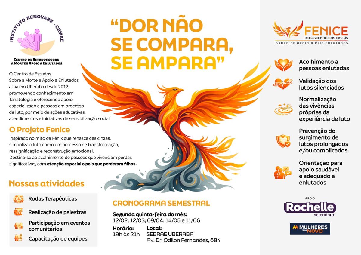 A I Roda Terapêutica de 2026 do Projeto Fenice – Renascendo das Cinzas será realizada em Uberaba nesta quarta-feira (12), às 19h, no Sebrae, na Avenida Odilon Fernandes, 684, no Centro. Promovido pelo Instituto Renovare CEMAI (Centro de Estudos sobre a Morte e Apoio a Enlutados), o encontro é coordenado pelas psicólogas e terapeutas do luto Vera Dias e Ednalva Oliveira Freitas. Neste ano, a iniciativa passa a atender enlutados por qualquer tipo de vínculo, ampliando o público-alvo.