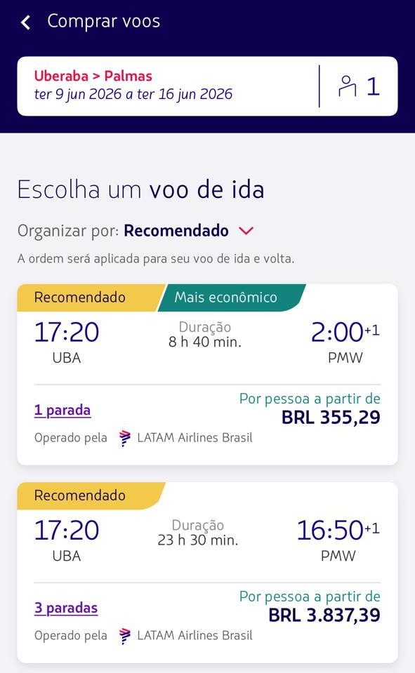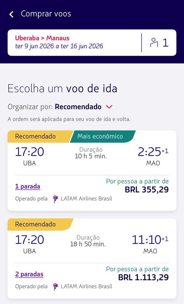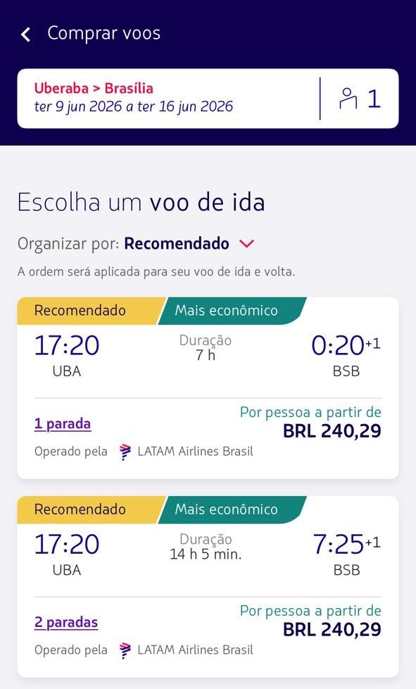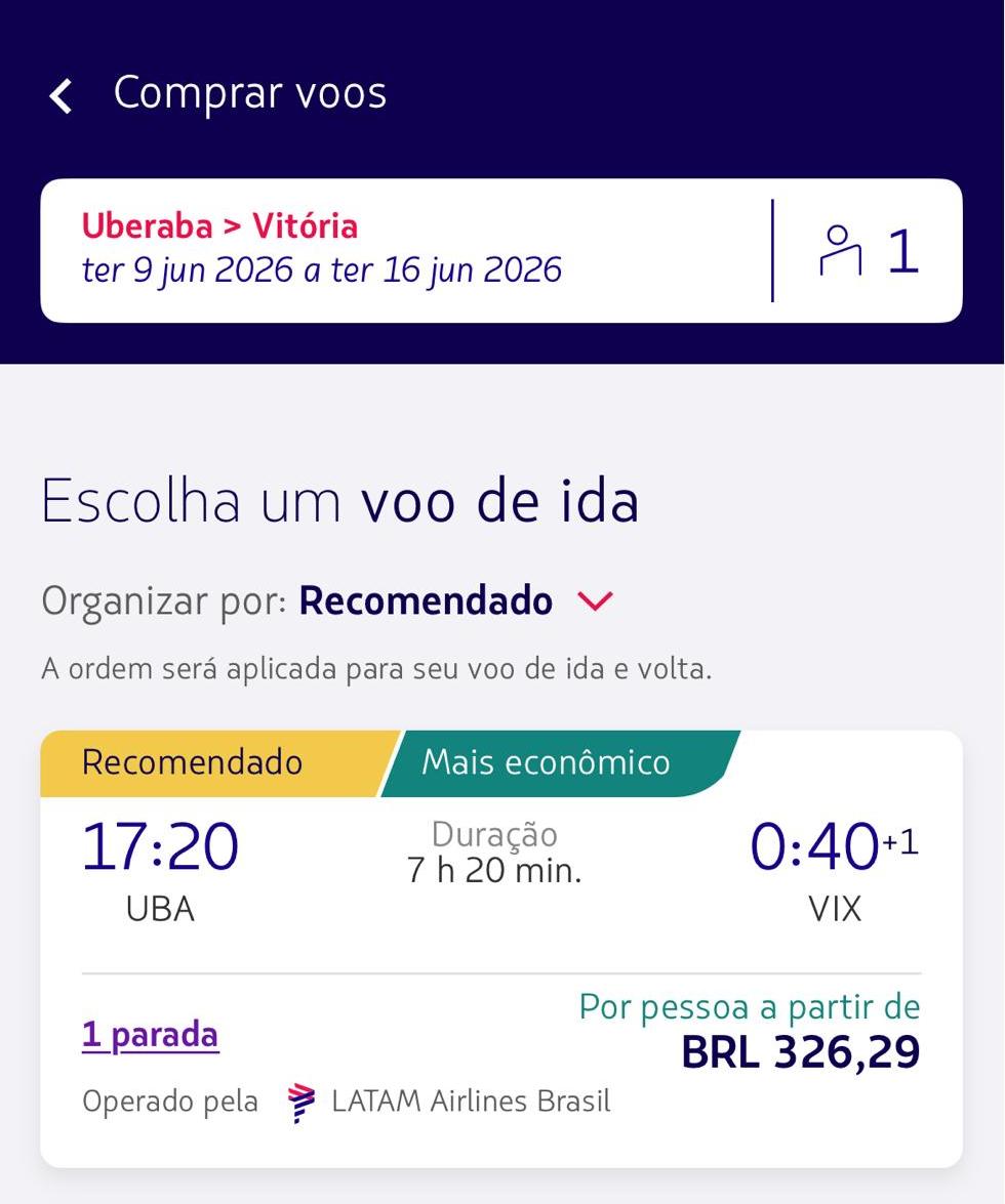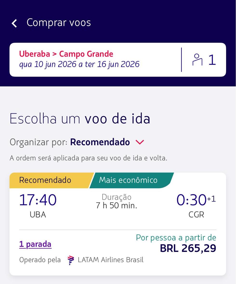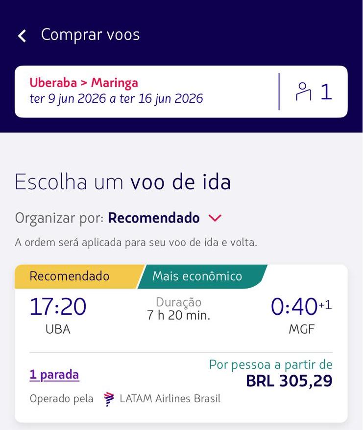 É nesse cenário que entram as promoções. Levantamento feito no sistema de vendas da companhia mostra passagens em valores considerados competitivos para uma série de destinos saindo de Uberaba com conexão em Guarulhos. Há opções a partir de R$ 240 para Brasília, R$ 265 para Campo Grande e R$ 305 para Maringá. Também aparecem tarifas de R$ 326 para Vitória, R$ 340 para Belém e R$ 355 para Manaus e Palmas, em datas consultadas para junho.