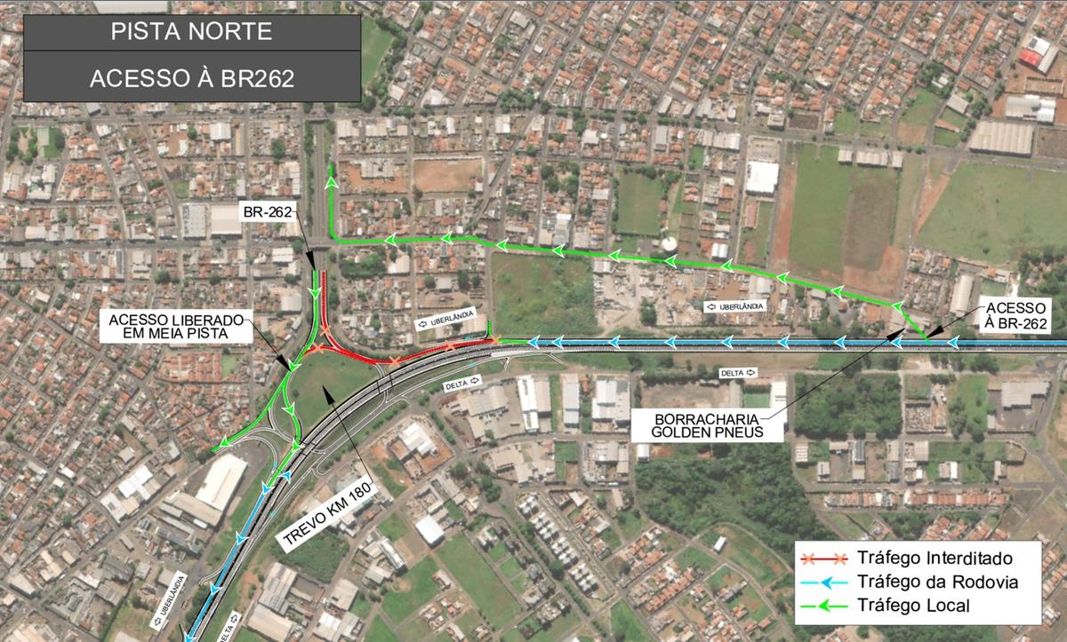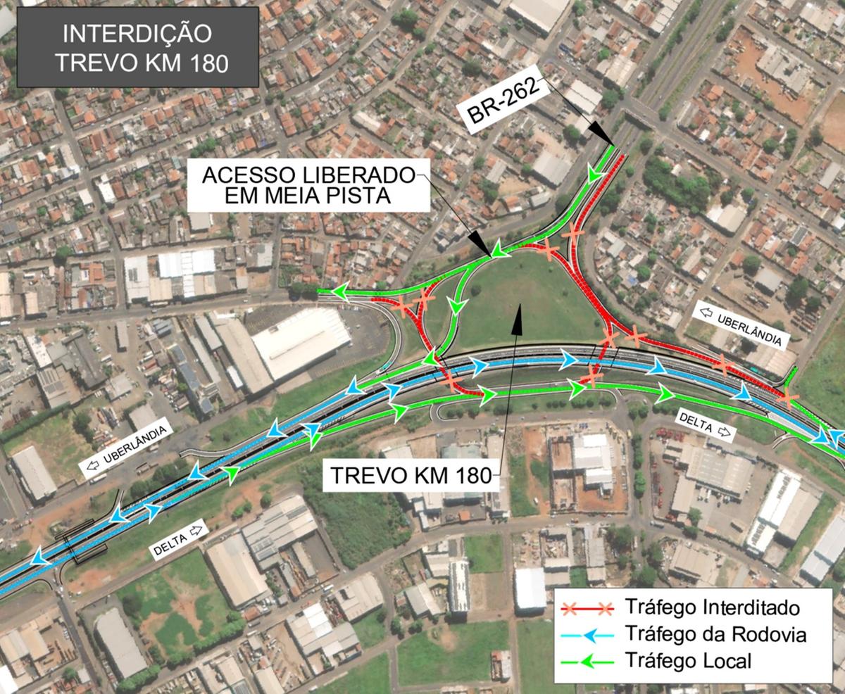 Já no sentido norte, em direção a Uberlândia, o acesso à BR-262 ficará interditado e precisará ser feito pelo km 181. Na saída da BR-262 para a BR-050, o tráfego vai operar em meia pista durante a execução dos trabalhos.