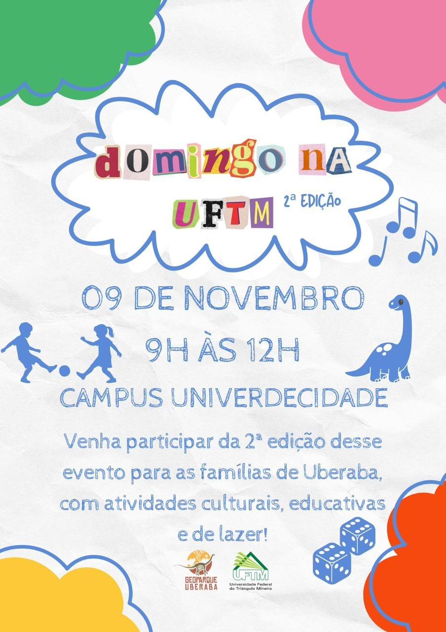 A Universidade Federal do Triângulo Mineiro (UFTM) promove neste domingo (9) a segunda edição do Domingo na UFTM, com atividades abertas à comunidade. O evento será realizado das 9h às 12h, no Campus Univerdecidade, em frente ao Parque das Barrigudas.