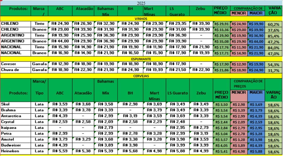 Nos vinhos, a oscilação entre estabelecimentos permanece significativa em 2025, mas alguns rótulos passaram a apresentar tetos mais baixos do que no ano anterior. O vinho argentino tinto, por exemplo, variava entre R$ 21,97 e R$ 69,00 em 2024. Em 2025, o intervalo passou para R$ 19,90 a R$ 36,90, indicando redução expressiva do valor máximo cobrado, embora ainda exista diferença relevante entre os supermercados. Já o vinho chileno tinto teve menor preço mais alto em 2025 (R$ 24,90, contra R$ 20,97 em 2024), mas o maior preço caiu de R$ 49,90 para R$ 39,90.