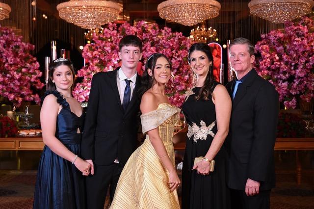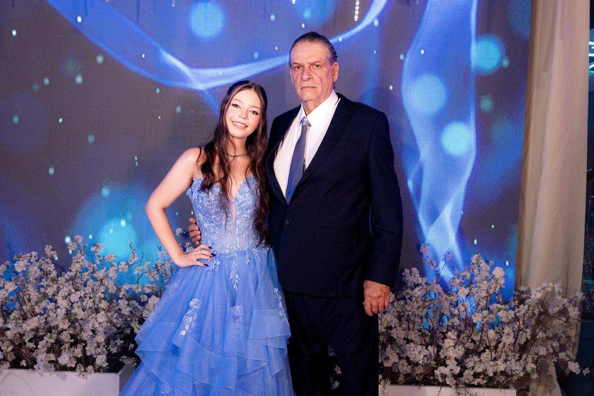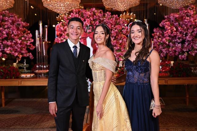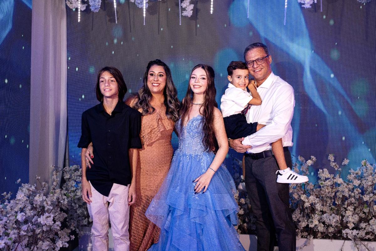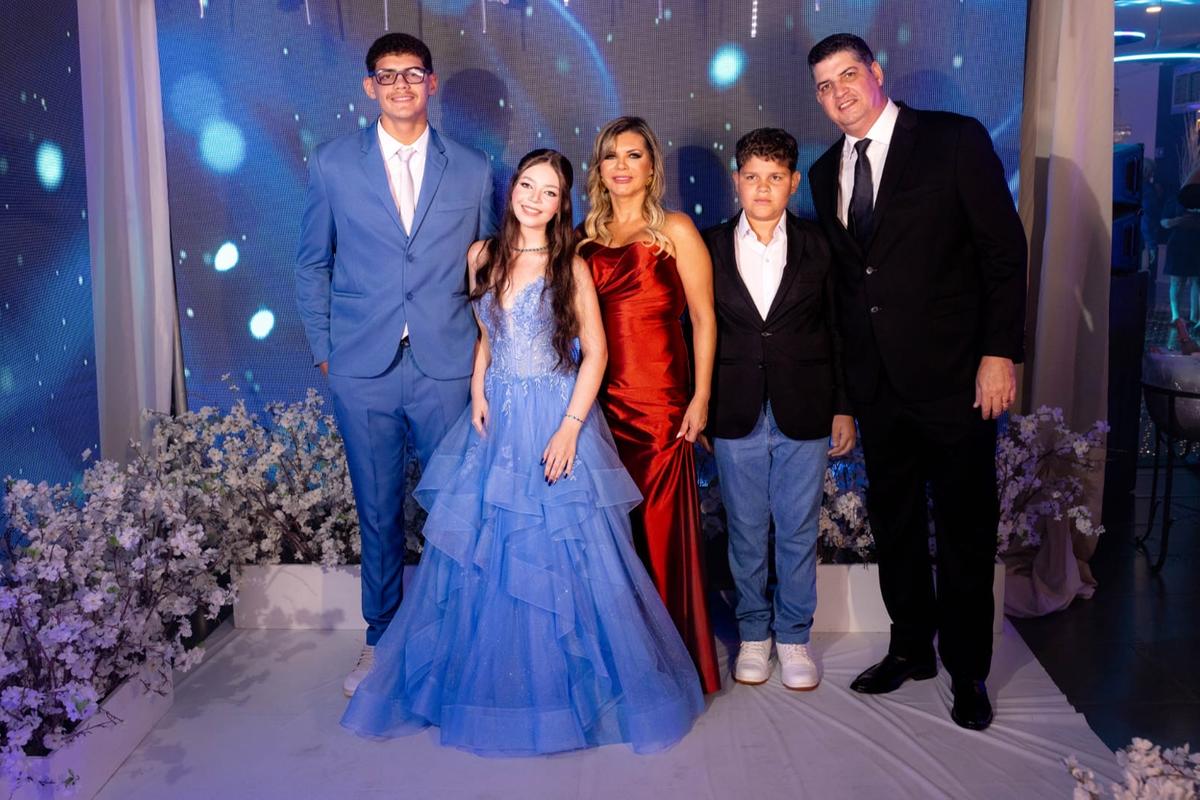 Ana Beatriz Paixão da Fonseca Andrade celebrou seus 15 anos em uma festa primorosa, cuidadosamente orquestrada pela cerimonialista Sheron Cantarelli. Ao lado de seus pais, Janaina Martins Paixão Andrade e Lucas Eduardo da Fonseca Andrade, e dos avós, João Francisco Menezes de Andrade e Mirza Teia da Fonseca, a noite foi um verdadeiro espetáculo de carinho e alegria. O ponto alto da noite foi a valsa, onde Ana Beatriz dançou com o pai, o avô João Francisco, o primo João Pedro Lourenço e, em um momento emocionante, com a mãe Janaina Martins. O príncipe Pietro Gabriel também marcou presença. As homenagens tocaram a todos: Anna Luiza Dabner cantou, os pais exibiram uma mensagem especial no telão, e as amigas Ana Sofia Desllane e Kyvia Yane leram textos emocionantes. Após a valsa, o pai presenteou Ana Beatriz com um lindo anel, que complementou o conjunto de joias (colar, pulseira e brincos) entregue mais cedo. Uma noite singular, celebrando a vida e os sonhos da debutante.