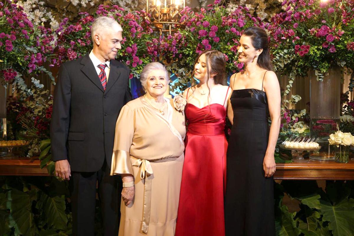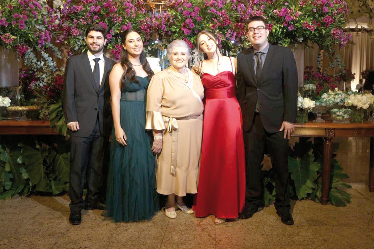 Elenice Salomão, a grande homenageada, estava simplesmente radiante. Vestindo um modelo impecável, de corte clássico e muito bom gosto, ela completou o visual com um colar deslumbrante que refletia sua sofisticação natural. Com um sorriso generoso e brilho nos olhos, recebeu amigos e familiares para celebrar uma vida inteira de histórias, conquistas e amor.