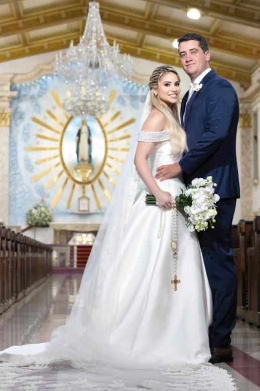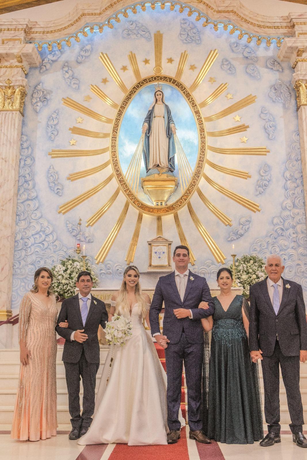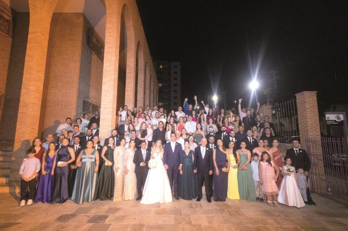 A noiva, deslumbrante e serena, atraiu todos os olhares com sua beleza clássica e um sorriso que revelava emoção e plenitude. O noivo, elegantemente vestido, não conseguia esconder o brilho nos olhos ao vê-la entrar na igreja. Logo após a celebração, um dos momentos mais especiais foi registrado: a tradicional foto nas escadarias da Igreja Medalha Milagrosa, reunindo todos os convidados. Um clique simbólico, que eterniza não apenas o amor dos noivos, mas também a presença de cada pessoa que compartilhou desse dia histórico.