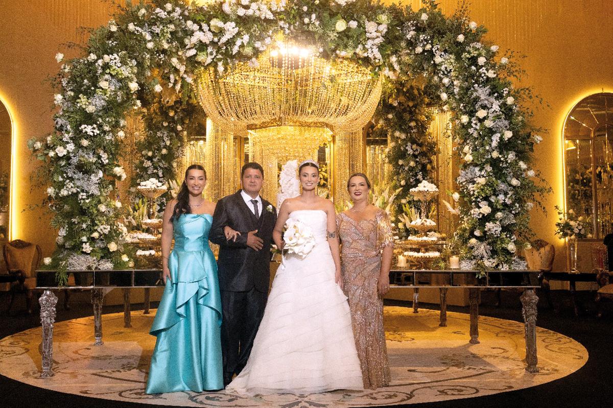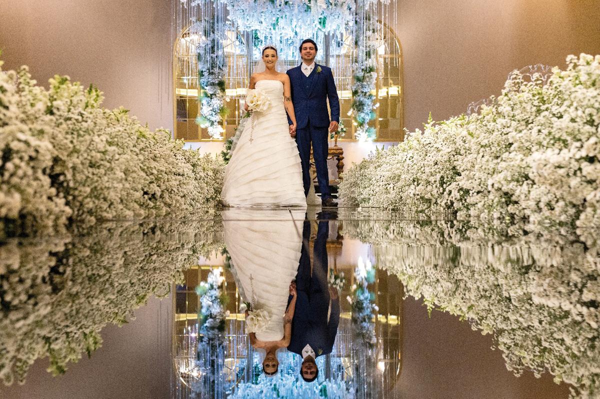 Ana Rita e Cairo celebraram um dos dias mais marcantes de suas vidas no Crystal Garden, em Uberaba, um espaço que se transformou em cenário de grande beleza e emoção. O salão foi preparado de forma especial para receber dois momentos distintos, mas igualmente memoráveis: a cerimônia e a festa. O início da noite foi dedicado à cerimônia, realizada em um ambiente de grande impacto visual. Os lustres imponentes criavam um clima de sofisticação, enquanto a passarela de espelho refletia cada detalhe da decoração e da entrada triunfal da noiva. Um cenário planejado para emocionar, e que cumpriu seu papel com perfeição.