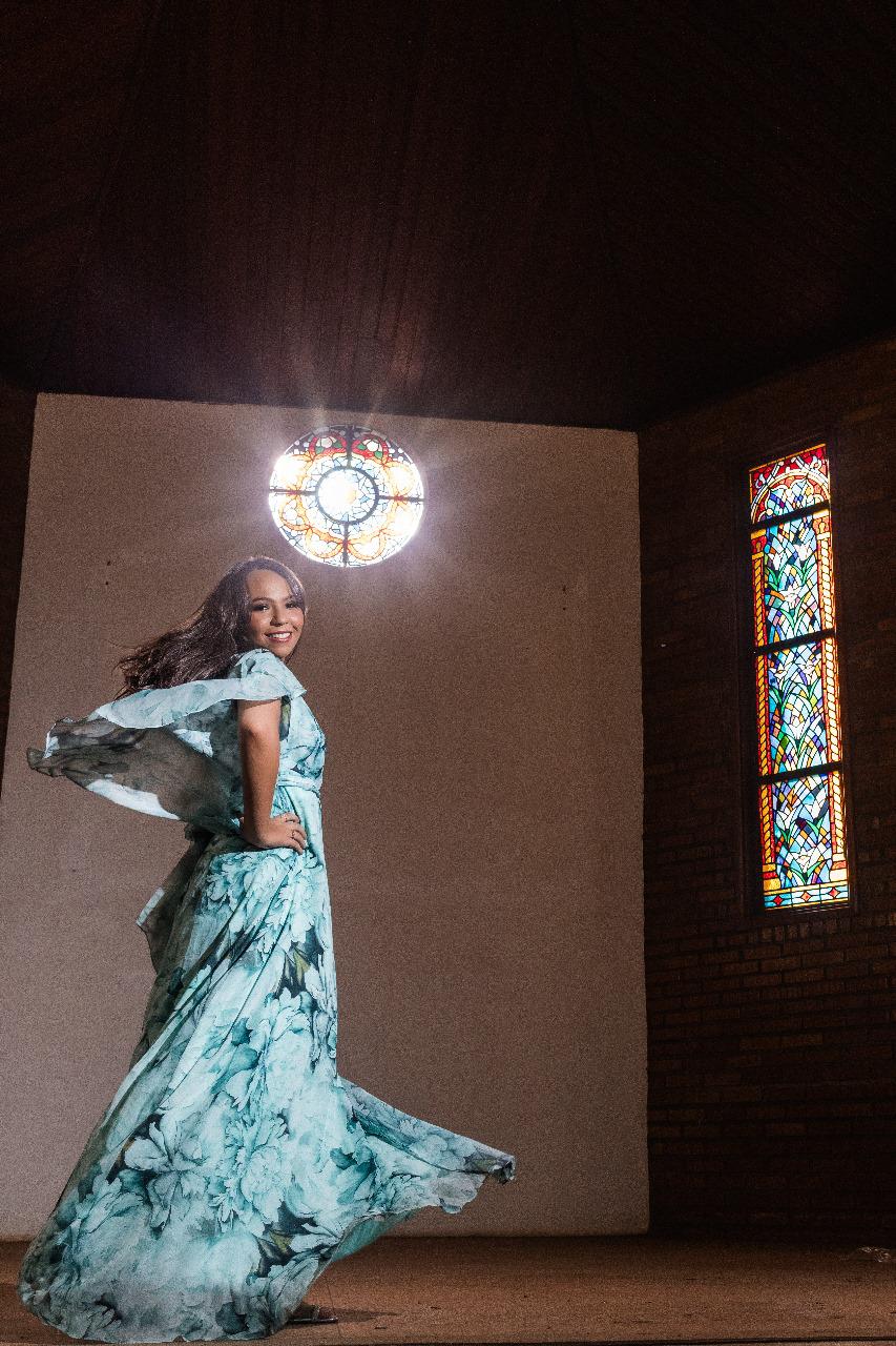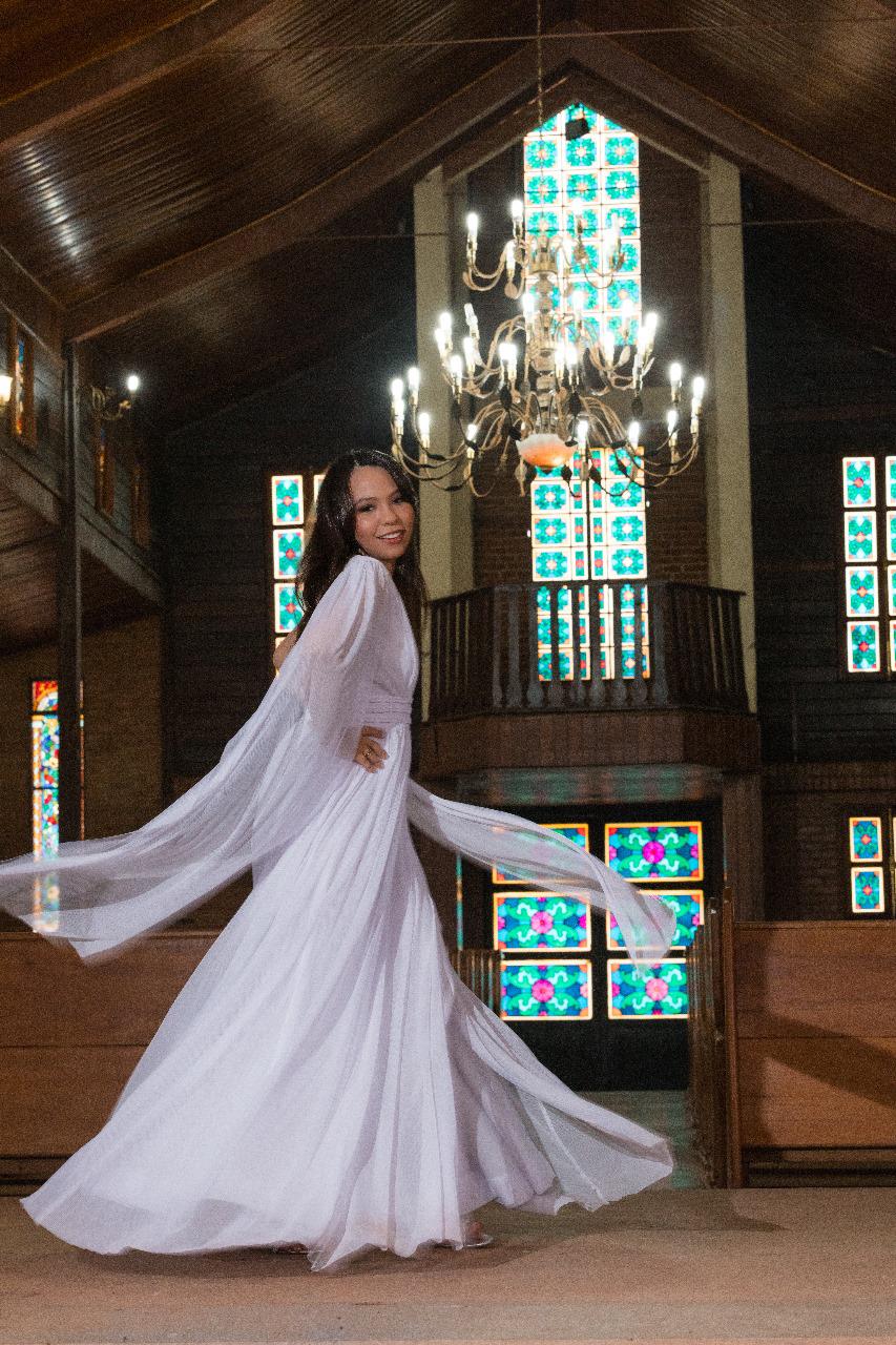 As fotos no estúdio mostraram toda a delicadeza e elegância de Maria Gabrielle, com produções que valorizaram sua beleza e naturalidade. Depois, fomos até uma igreja de atmosfera mais escura, onde a luz entrando pelas janelas criou um cenário poético, cheio de emoção e profundidade — uma verdadeira pintura feita com luz.