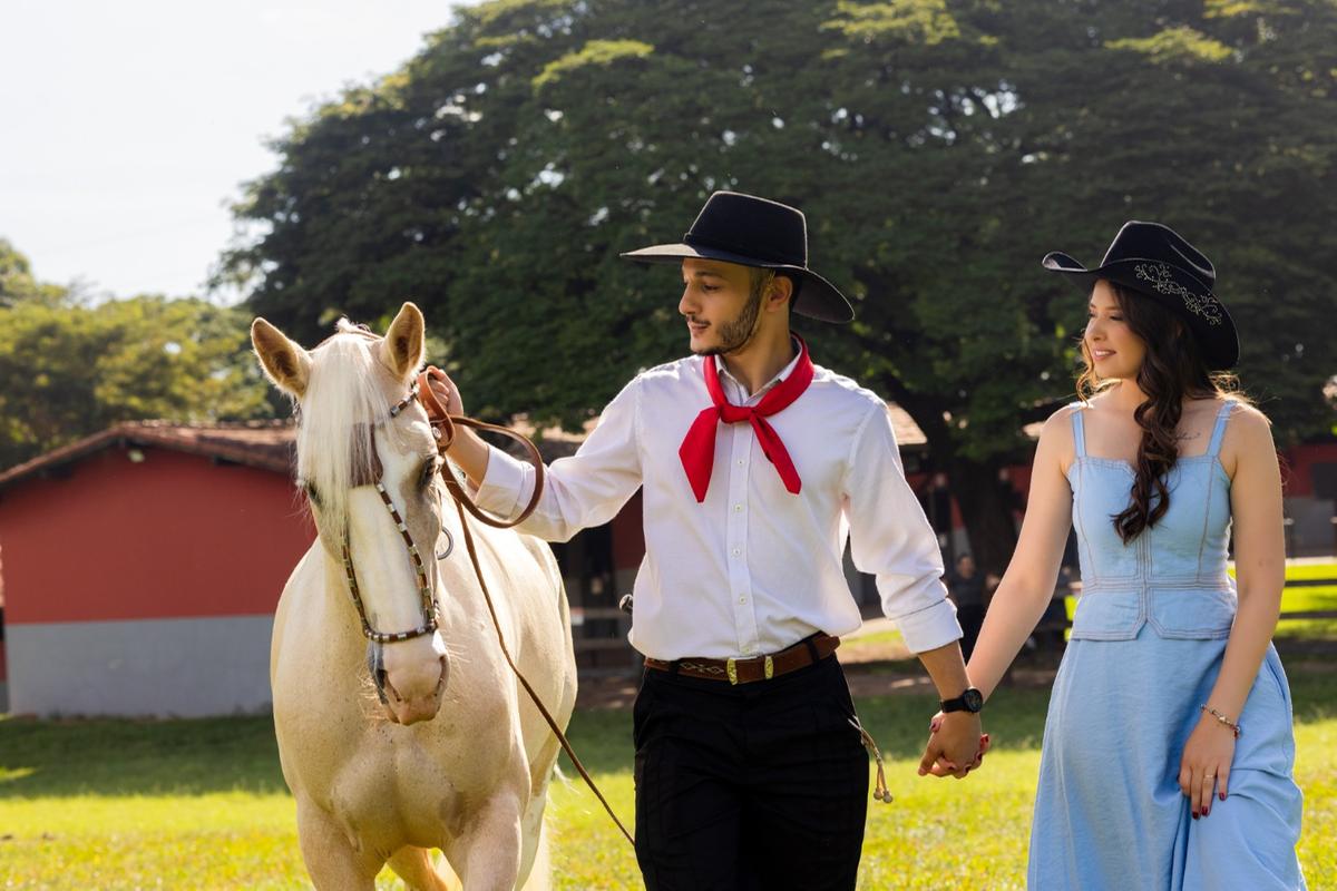 Histórias de amor muitas vezes atravessam caminhos inesperados — e foi assim que Lucas e Gabriela se encontraram. Natural do sul do país, Lucas escolheu Uberaba para viver e foi justamente aqui que conheceu Gabriela, iniciando uma linda história que agora caminha para o casamento. O casal começou o pré-wedding com um elegante ensaio em estúdio, onde as fotos revelaram toda a sintonia, carinho e cumplicidade entre eles. Em um ambiente intimista, os registros ficaram marcados pela leveza e pelo olhar apaixonado que um dedica ao outro. Na sequência, o ensaio ganhou novos cenários ao ar livre no tradicional Jockey Club de Uberaba. À beira do lago e em meio à natureza, Lucas e Gabriela protagonizaram imagens encantadoras. Um dos momentos mais especiais do ensaio foi quando Lucas surgiu vestido com o traje típico do sul do Brasil, homenageando suas origens gaúchas. Ao lado de um belíssimo cavalo branco e com Gabriela em um vestido elegante, as fotos ganharam um ar cinematográfico, misturando tradição, romantismo e muita personalidade. O resultado foi um ensaio marcante e cheio de significado, celebrando não apenas o amor do casal, mas também as histórias e raízes que cada um traz consigo. Um registro inesquecível de uma nova etapa que está apenas.