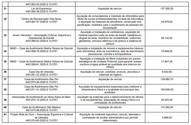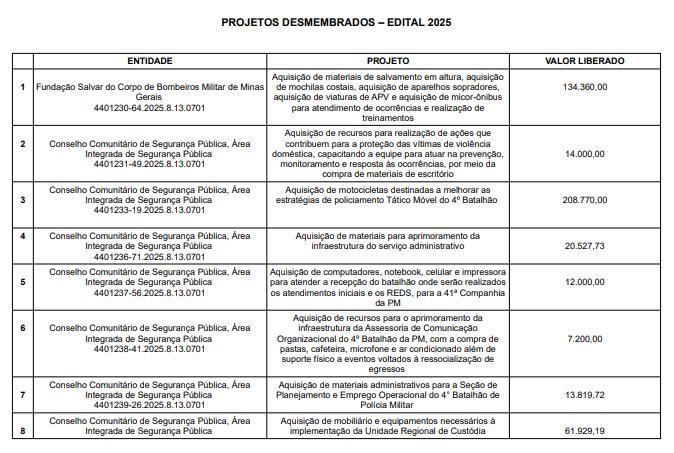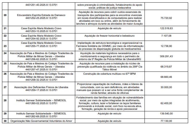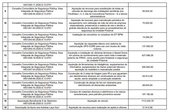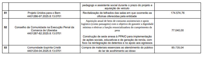 As instituições beneficiadas com a divisão dos recursos, os projetos aprovados e os valores são os seguintes:
