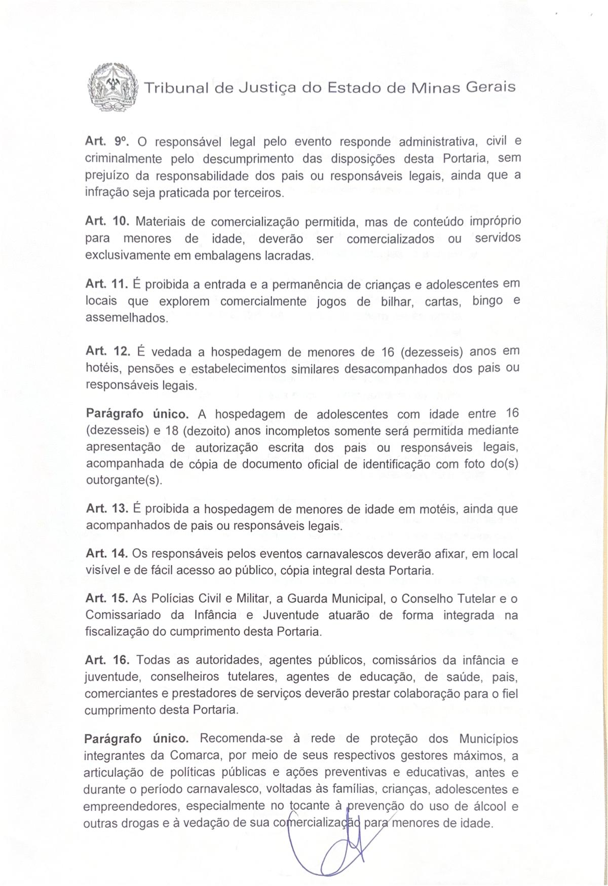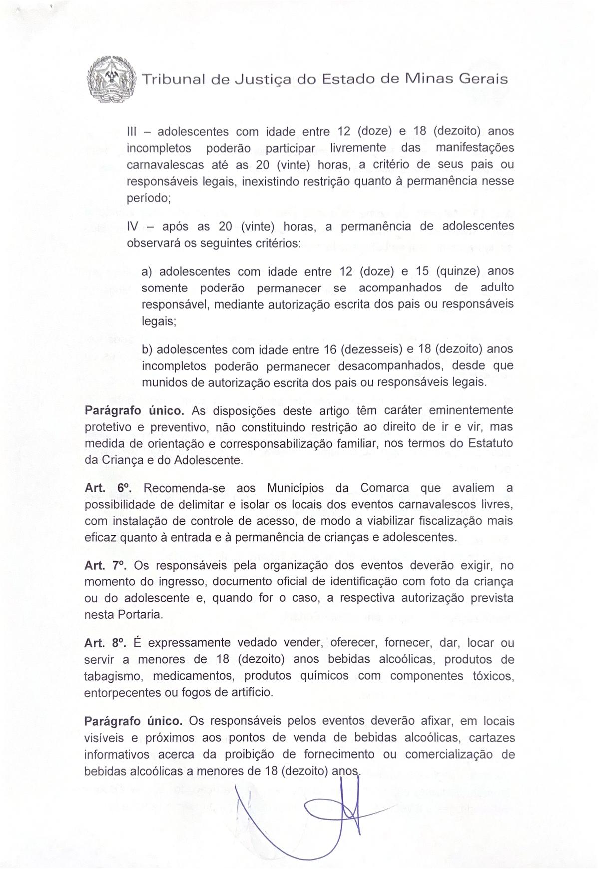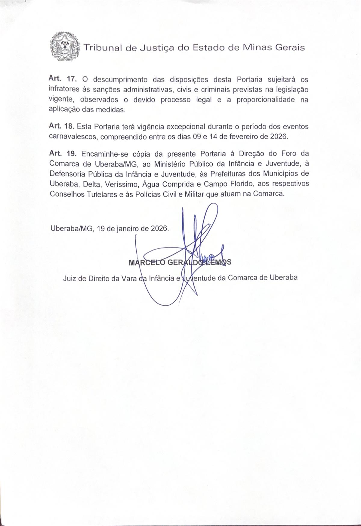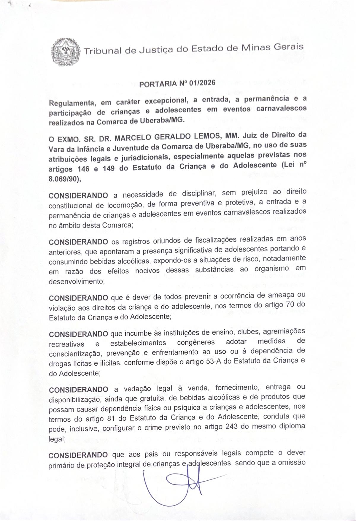 Esta é a íntegra da portaria do juiz da Infância e da Juventude para o período de carnaval em Uberaba: