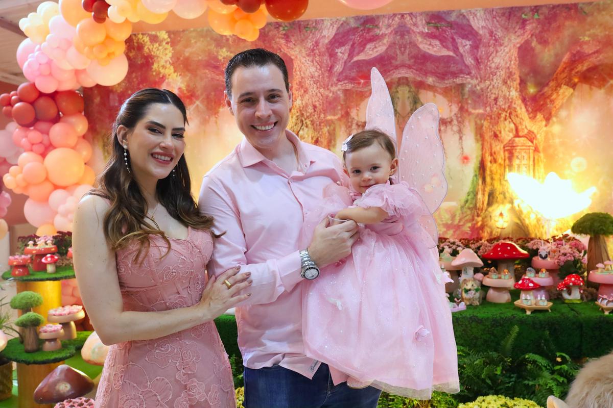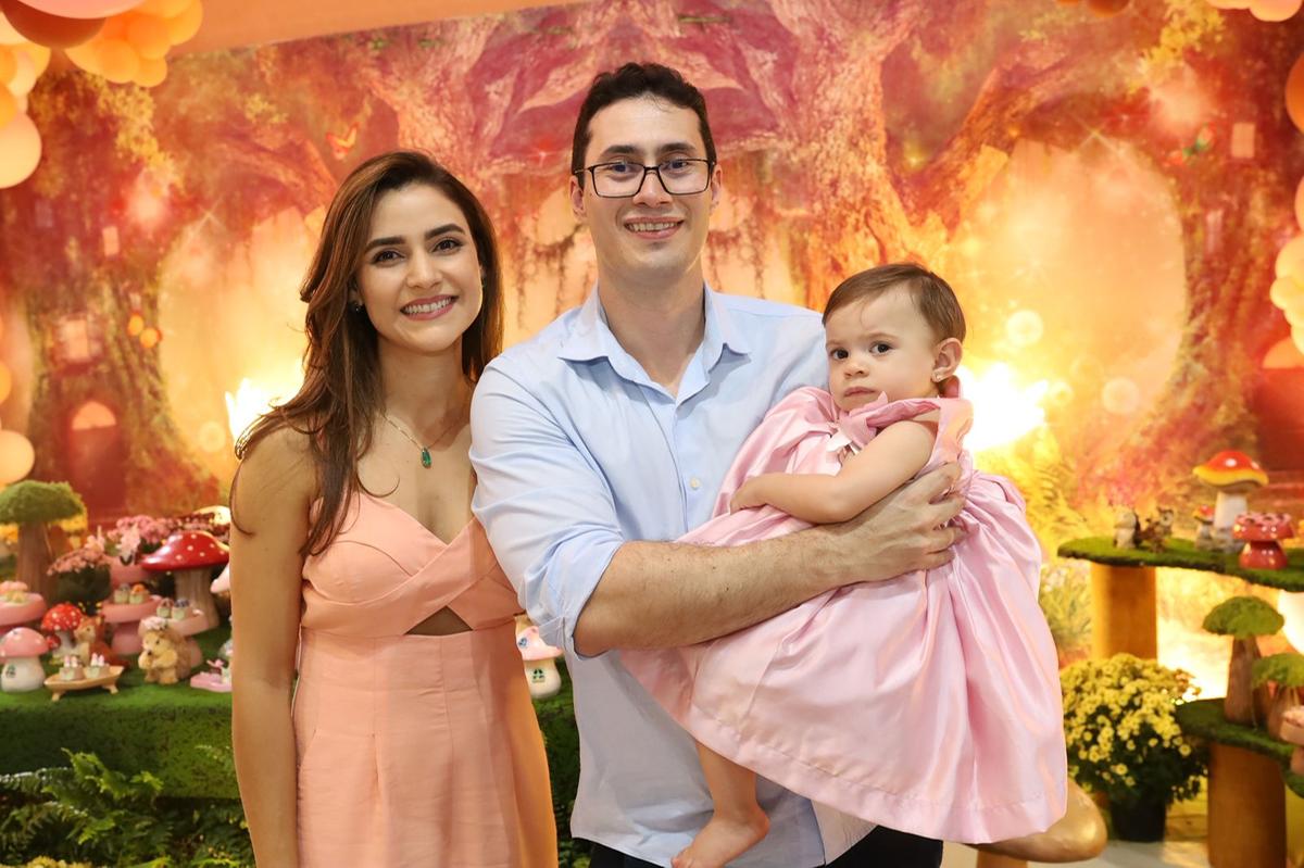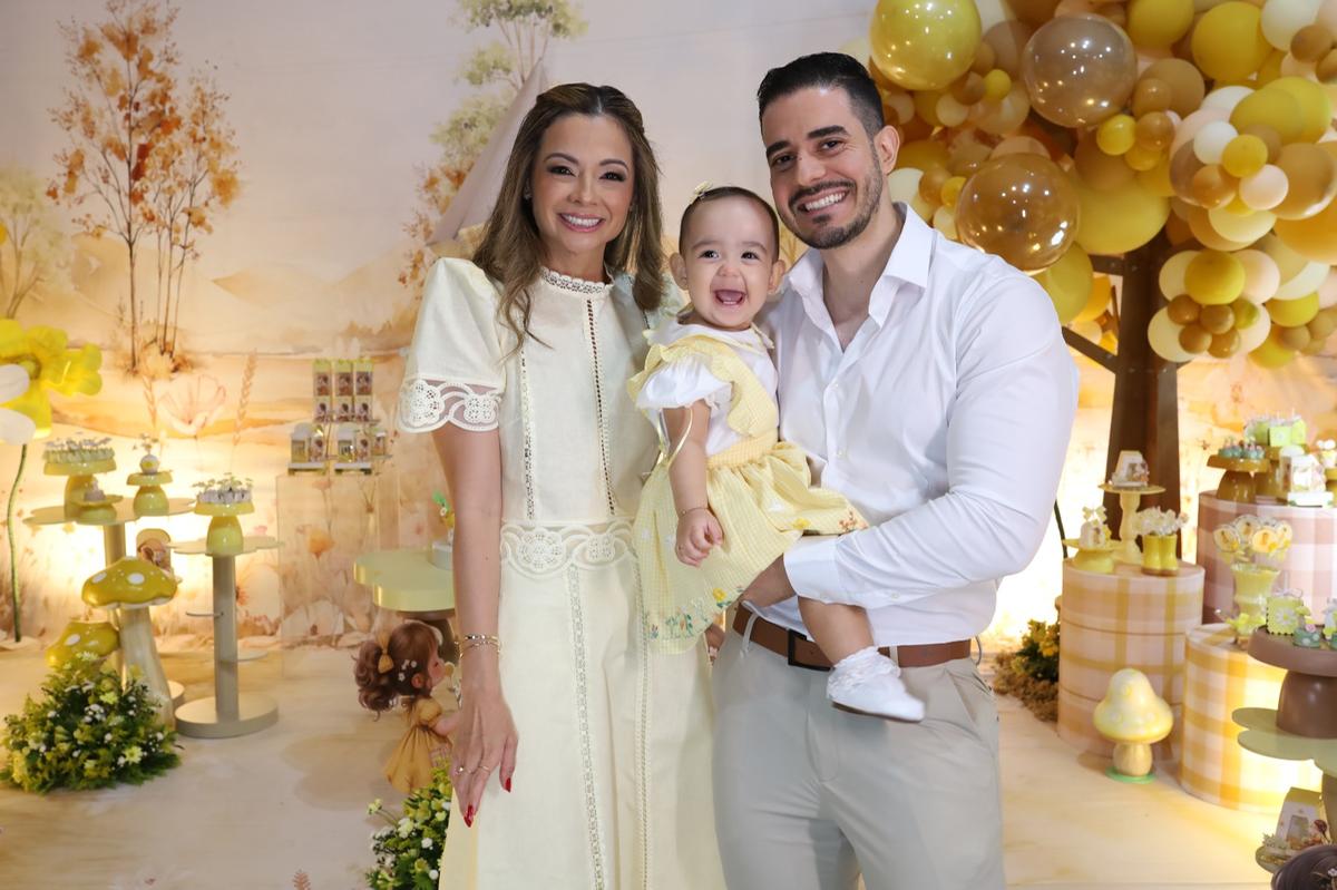 José Guilherme Schwam Júnior e Laryssa Manso de Lima Schwam radiantes no primeiro aninho da filha Celine. (Foto/Babi Magela)