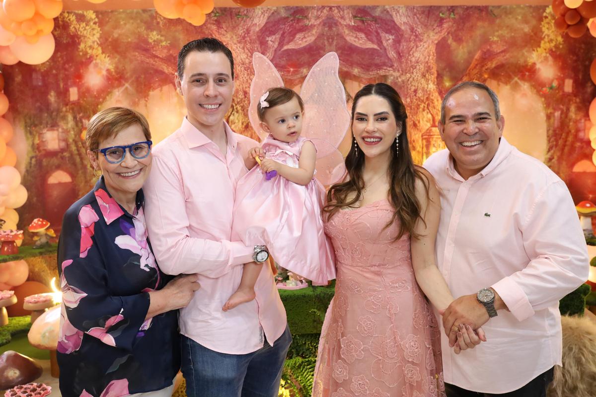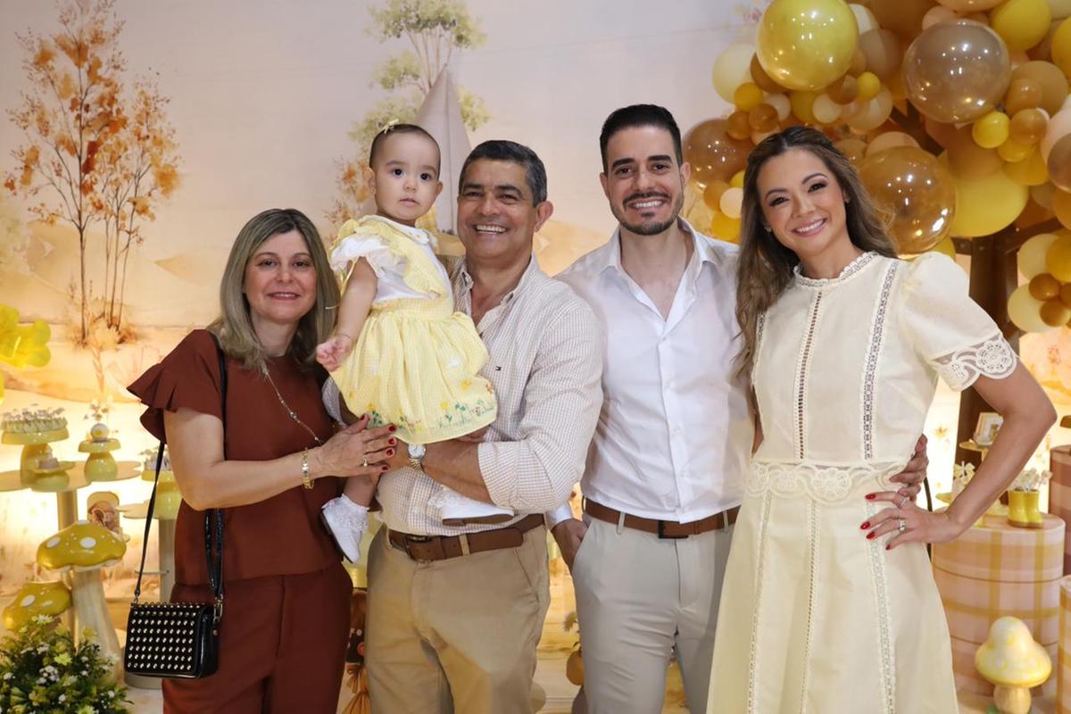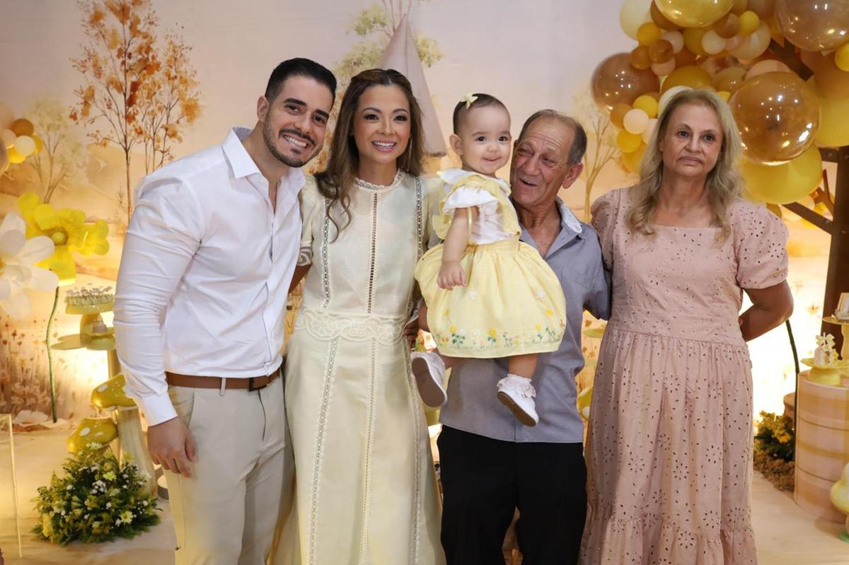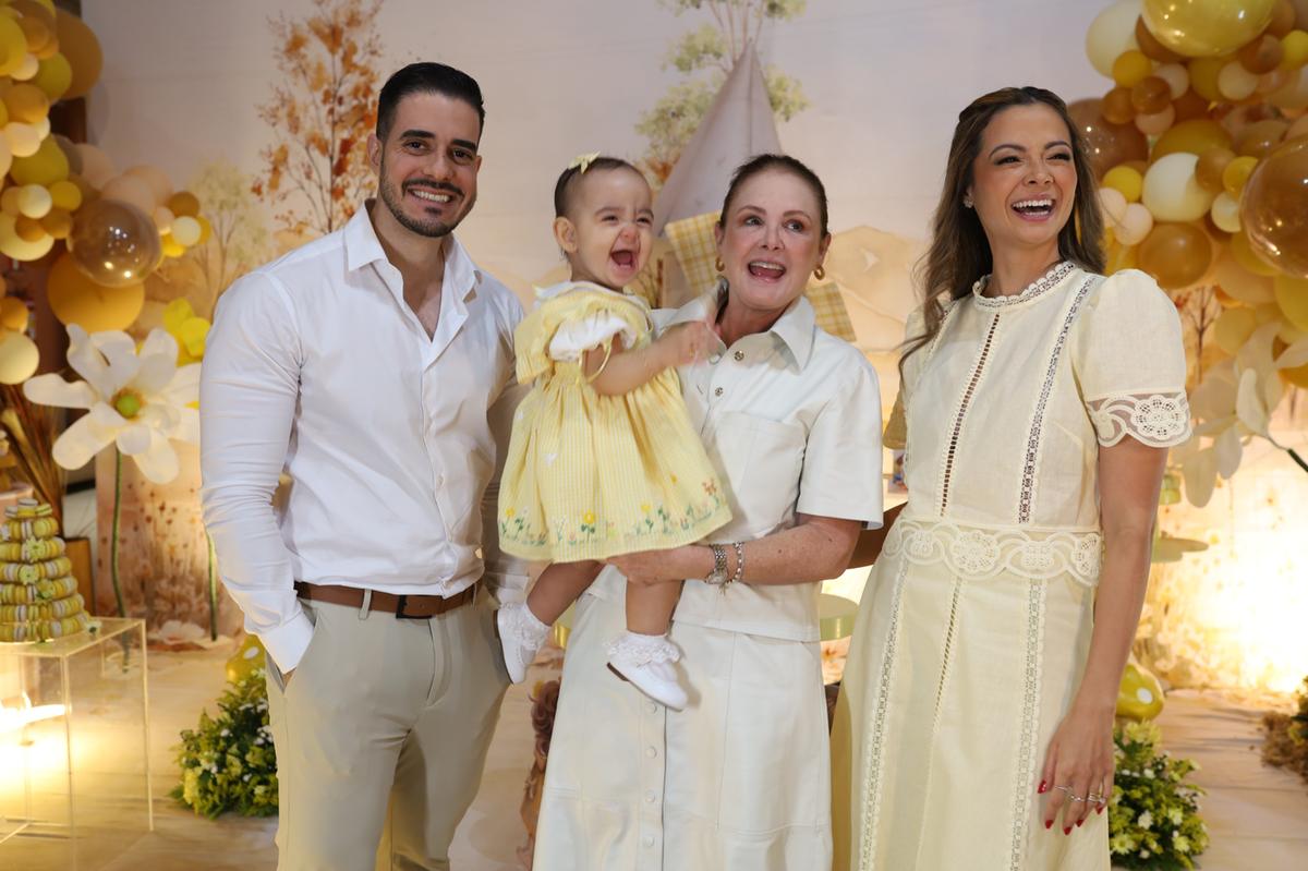 José Guilherme Schwam Júnior e Laryssa Manso de Lima Schwam radiantes no primeiro aninho da filha Celine. (Foto/Babi Magela)
