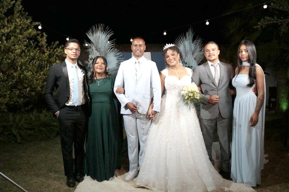 Raiane Santos da Silva soares e Bruno dos Santos Soares com os pais e irmãos dela, Edclecio Araújo dos santos, Edenilza Araújo dos Santos,Caio Araújo dos Santos e Rita Marley Santos de Oliveira (Foto/Aline Silveira)