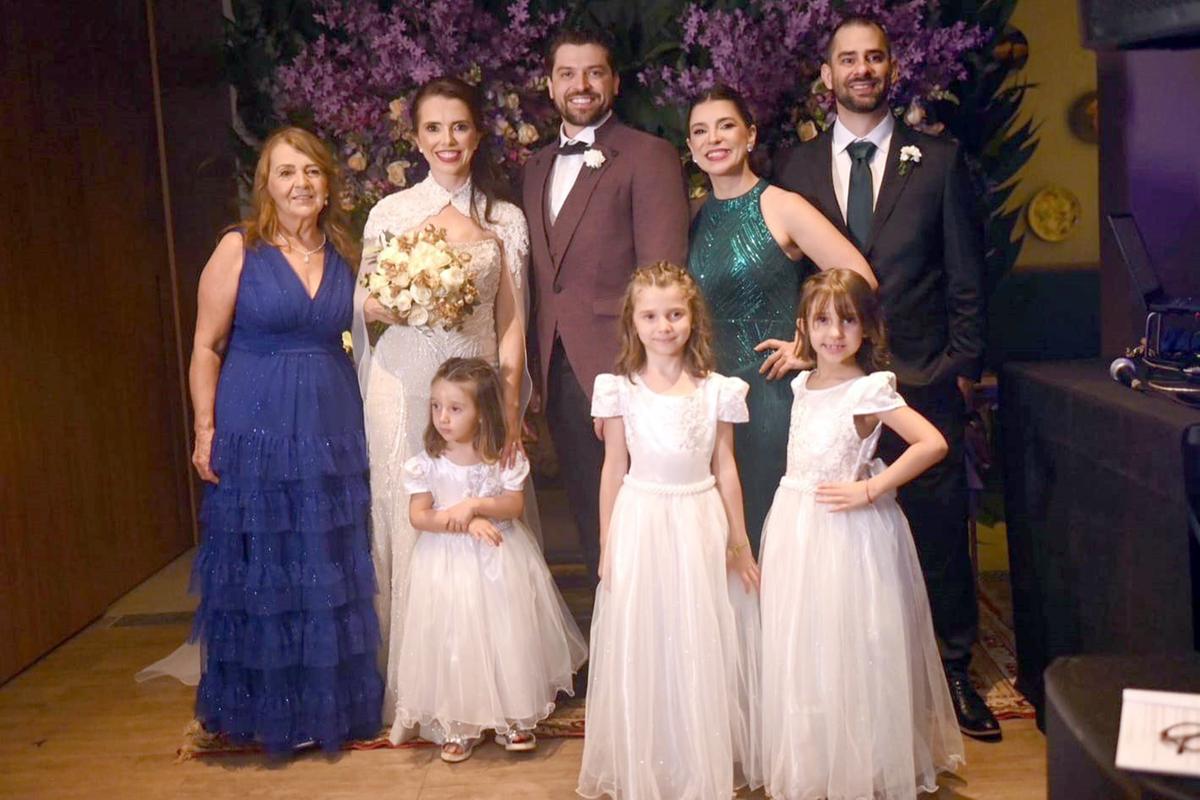 Os noivos com a mãe dela, Maria Aparecida, Julia Ferreira, irmã da noiva de bracos dados com Eduardo Feltrin, Anne e Luise cervato, filhas da noiva e Helena (Foto/Arquivo pessoal)