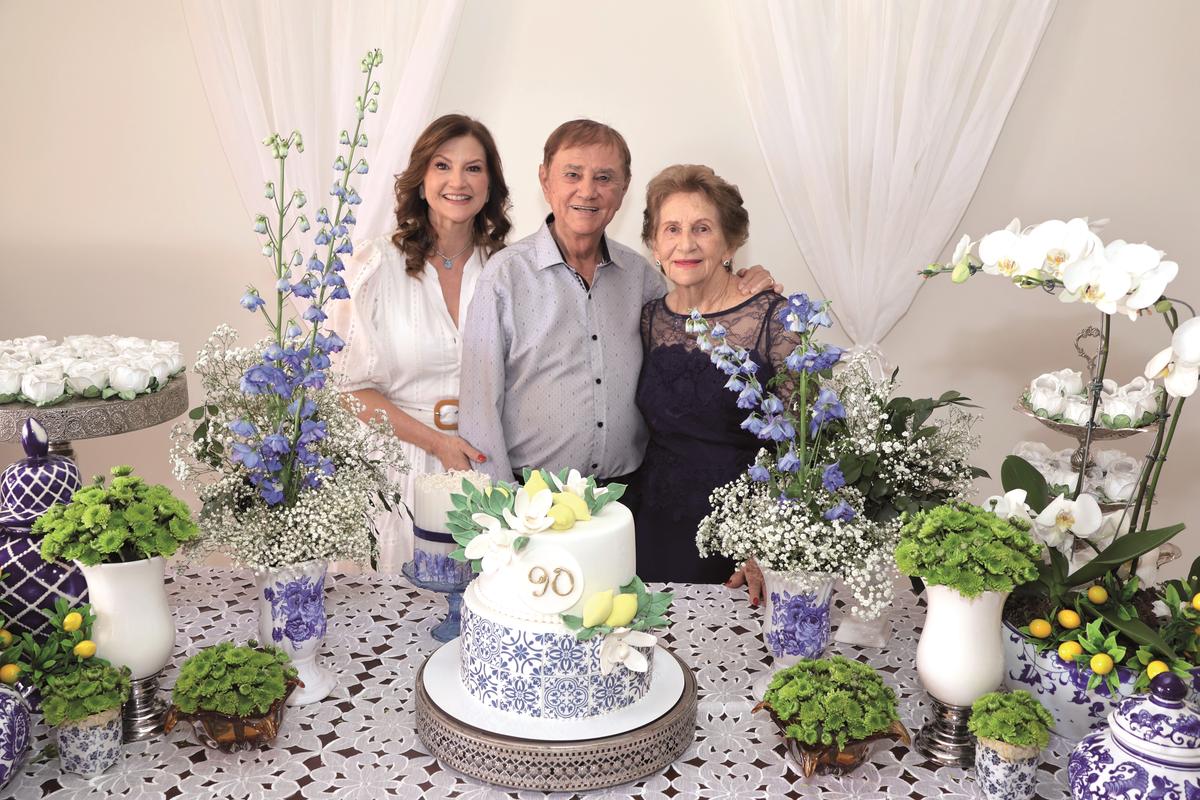Alípio Quintino Rocha, celebrou seus bem vividos 90 anos, na foto com a esposa, Dulce Bertulucci Rocha e com a filha, Denise Bertulucci Rocha Rodrigues (Foto/Paulo Lúcio)