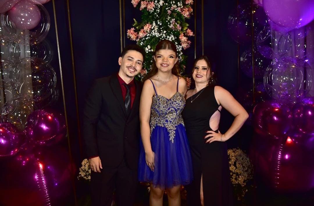 Florença Souza Freitas Rosa ladeada pelos pais, Rosa dos Reis Souza e Cláudio de Freitas Rosa na noite mais que especial dos seus 15 anos (Foto/Gabriel Spiradeli)