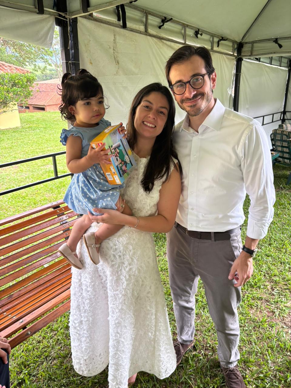 Os noivos com a afilhada dela, Laurinha Molinero Pimenta que será uma das damas de honra na cerimônia religiosa que acontece em abril de 2026 aqui em Uberaba (Foto/Arquivo pessoal)