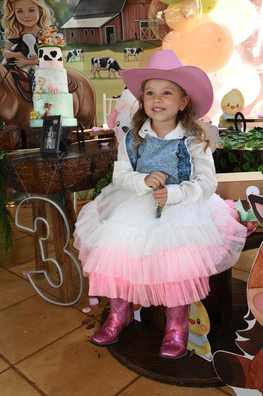 Florença comemorou seus 3 anos em grande estilo, com uma festa no tema Fazendinha, em clima bem country. Vestida de boiadeira, com chapéu, violão e bota rosa, encantou a todos ao fazer sua entrada montada em sua linda égua, do Haras Costa Ferreira, em um momento cheio de alegria e encanto