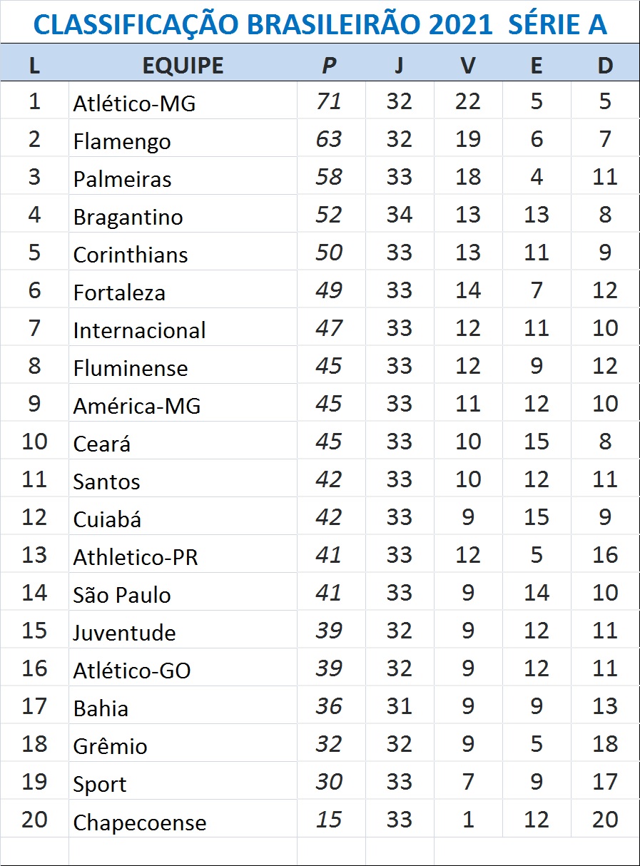 Agora a diferença para o Fortaleza, sexto colocado, com 49, é de apenas quatro pontos. Importante lembrar que o sexto colocado na classificação garante vaga na Pré-Libertadores do ano que vem. Fato é que os dois rivais cearenses podem disputar o torneio continental em 2022.