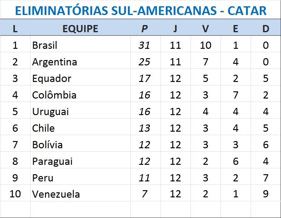 Já a Venezuela praticamente deu adeus às chances de estar na Copa do Mundo. A seleção vinho tinto permaneceu na última colocação, com sete pontos.