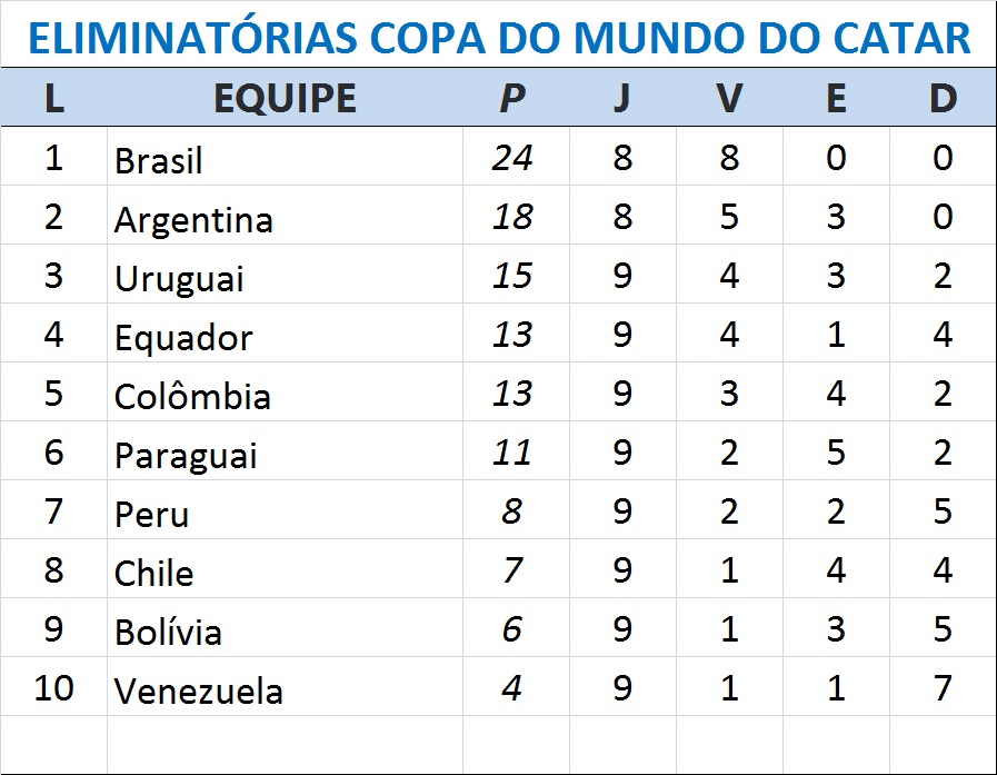 Tem 24 pontos, cinco a mais que a Argentina, segunda colocada, e segue sem perder para o Peru na competição. Em 13 jogos, são nove vitórias e quatro empates diante do rival contra o qual está acostumado a jogar e que Tite mais enfrentou desde que assumiu em 2016 a seleção. Os peruanos permanecem no sétimo lugar, com oito pontos.