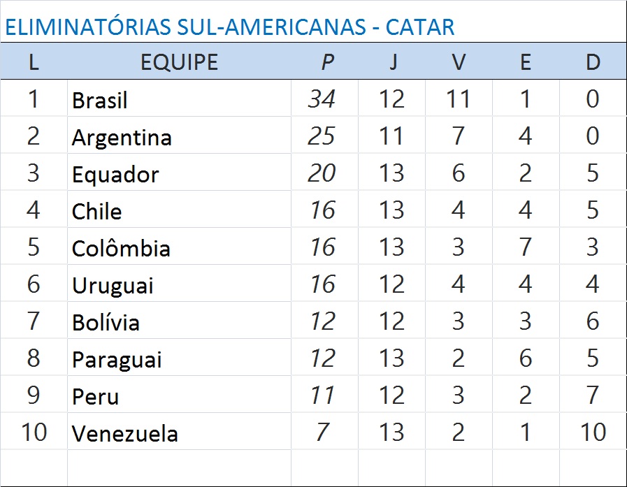 O Brasil está oficialmente na Copa do Mundo do Catar. Garantiu matematicamente sua classificação ao vencer a Colômbia por 1 a 0 nesta quinta-feira à noite, na Neo Química Arena. Com 34 pontos em 12 partidas a seleção ficará no mínimo em quarto lugar nas Eliminatórias Sul-Americanas - classificam-se quatro equipes diretamente e a quinta colocada vai para a repescagem.