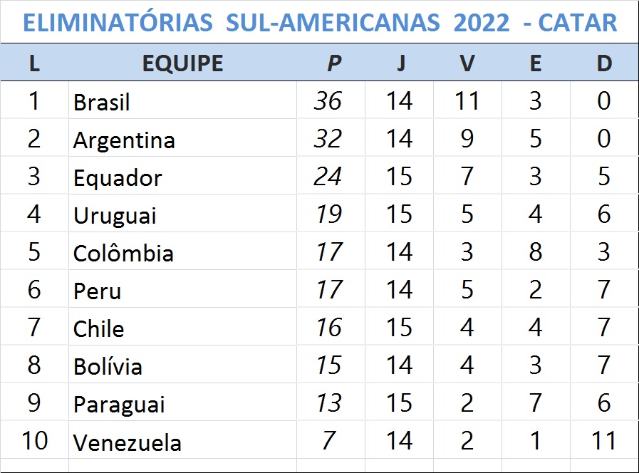 Líder isolado das Eliminatórias com 36 pontos e garantido desde o ano passado na Copa do Catar, o Brasil tem como próximo compromisso o duelo com o Paraguai, terça-feira, às 21h30, no Mineirão. No mesmo dia, o Equador duela com o Peru, em Lima. Os equatorianos somam 24 pontos, no terceiro lugar, e estão perto de garantir um lugar no Mundial, muito vaiado pelos torcedores depois do apito final.
