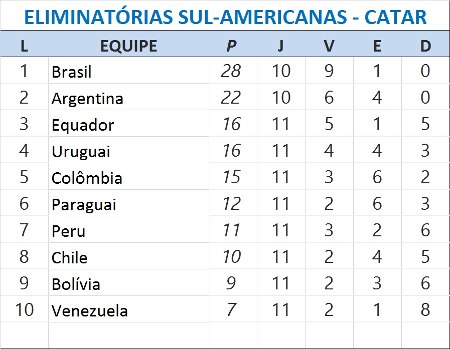 Na próxima rodada, a 12.ª, o Equador enfrenta fora de casa a Colômbia nesta quinta-feira, às 18 horas (de Brasília), no estádio Metropolitano Roberto Menéndez, em Barranquilla. No mesmo dia, às 21 horas, a Venezuela visita o Chile no estádio San Carlos de Apoquindo, em Santiago.