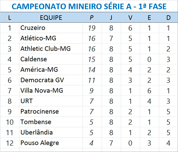 Já o Verdão, com apenas cinco pontos, amarga a vice-lanterna do Mineiro. Quem também não gostou do resultado foi o América, que ficou no empate por 0 a 0 com a URT, no sábado (19), no estádio Zama Maciel, em Patos de Minas. O Coelho, com 14 pontos, caiu para o 5º lugar, fora dos classificados à próxima fase. Cruzeiro (19 pontos), Atlético e Athletic, ambos com 16, são os três primeiros colocados.