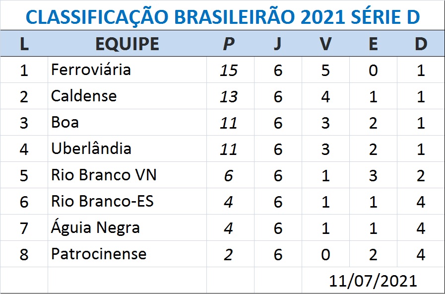 Os dois times voltam a campo no próximo domingo pela sétima rodada. Às 15h, o Rio Branco VN recebe a Caldense-MG no Estádio Olímpio Perim, em Venda Nova do Imigrante (ES). Um pouco mais tarde, às 16h, o Uberlândia estará em Rio Brilhante (MS), onde enfrenta o Águia Negra-MS, no Estádio Ninho d’Águia.