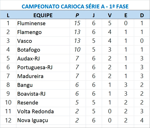 A vitória deixou o Flamengo com 13 pontos, dois atrás do líder Fluminense, tranquilo dentro da zona de classificação para as semifinais. São seis pontos na frente do quinto colocado, o Audax Rio, com sete. O Nova Iguaçu, de outro lado, vive uma situação complicada, porque soma apenas dois pontos, não venceu nenhum jogo e segura a lanterna.