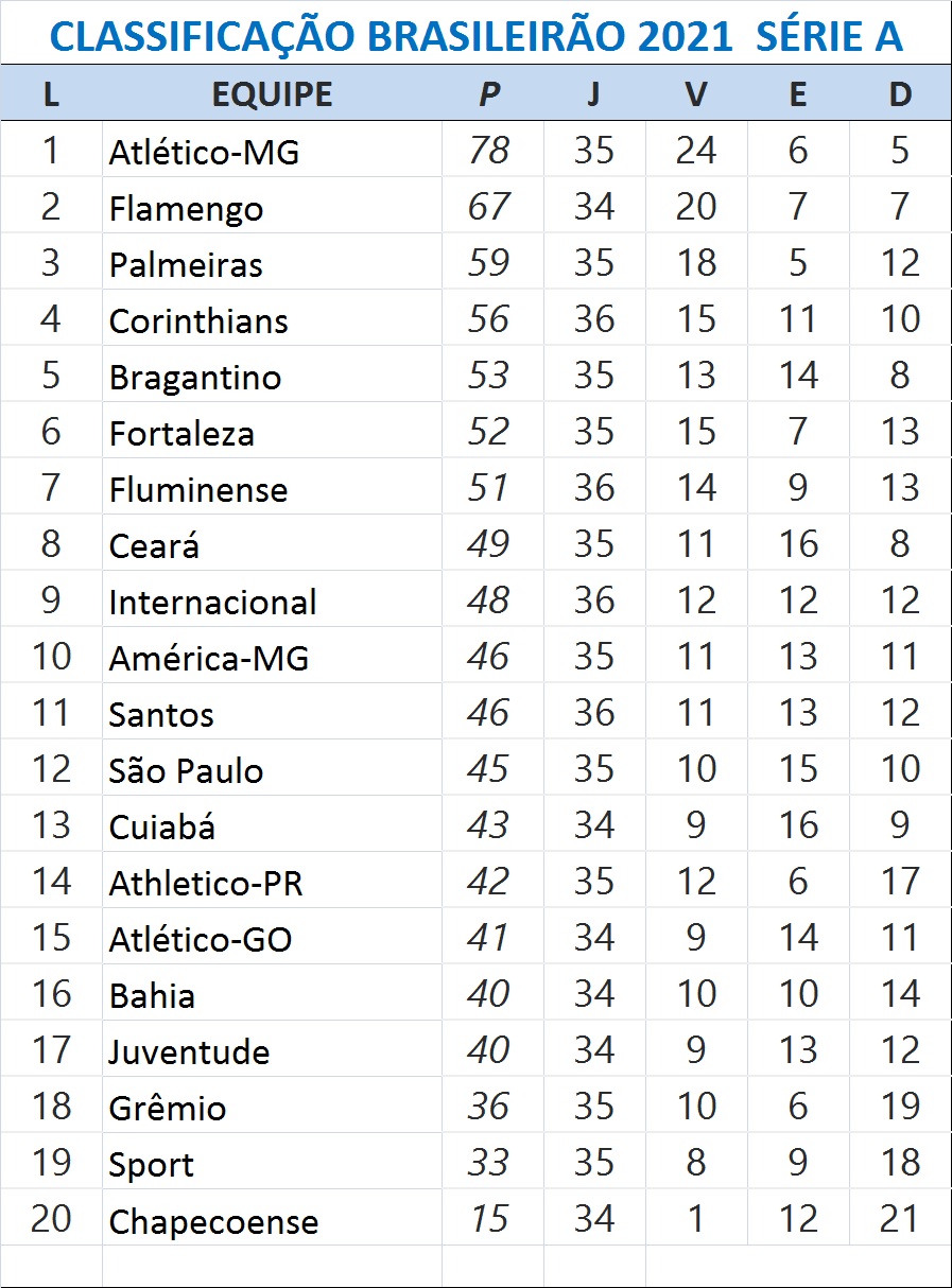 O Atlético disparou ainda mais na liderança, com 78 pontos, contra 67 do Flamengo, na segunda colocação, a uma vitória do título brasileiro. O Fluminense, por sua vez, ficou com 51 pontos, podendo sair da zona de classificação para a Copa Libertadores.