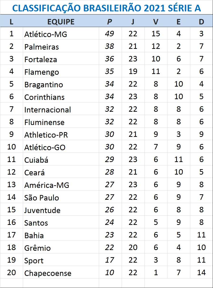 Com o resultado, o Corinthians chega aos 34 pontos, na sexta colocação. O Bragantino tem a mesma pontuação, uma posição acima