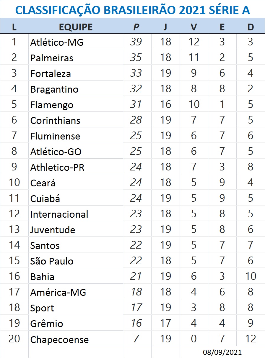 A Chapecoense soma apenas sete pontos, está na lanterna e é o único que ainda não venceu na competição. O Grêmio, aparece uma posição acima, já tem 16, enquanto o Bahia, primeiro fora da zona de rebaixamento, soma 21 pontos. Os catarinenses caminham a passos largos para regressar à segunda divisão.