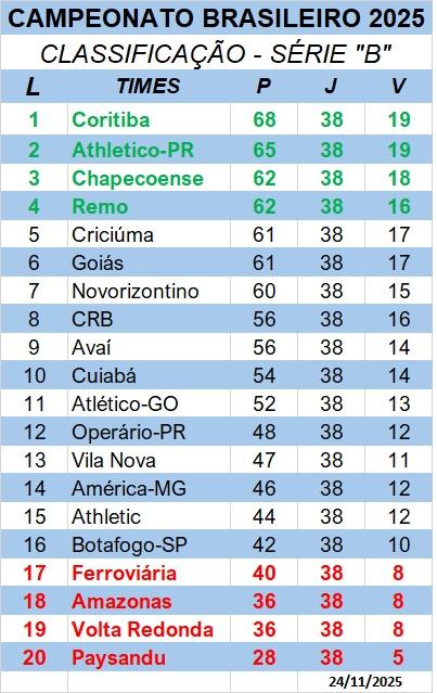 Assim, os quatro rebaixados para 2026 são: Paysandu, Amazonas, Volta Redonda e Ferroviária. Eles darão lugar a Ponte Preta, Náutico, Londrina e São Bernardo, promovidos da Série C.