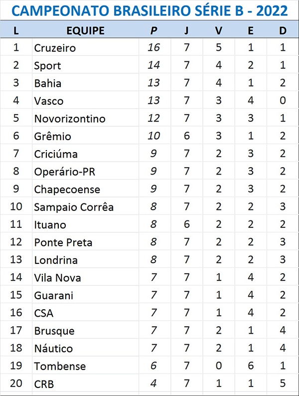 A quarta vitória consecutiva, todas sem sofrer gols, colocou o Cruzeiro na liderança, com 16 pontos, dois a mais do que o Sport, em segundo. Já o Náutico ficou na 15ª posição, com sete, próximo da zona de rebaixamento.
