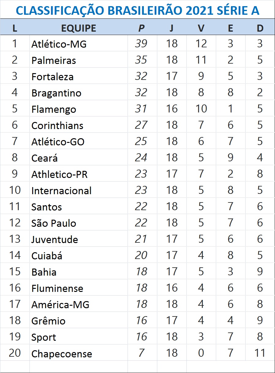 A igualdade no placar do jogo válido pela 18ª rodada da competição nacional mantém o Atlético na liderança, com 39 pontos, mas a distância para o vice-líder Palmeiras, antes de seis pontos, diminuiu para quatro, já que os palmeirenses venceram o Athletico-PR no sábado. O Bragantino, por sua vez, fica provisoriamente na quarta colocaçao, com 32 pontos, mesm pontuação do Fortaleza, que joga contra o Cuiabá nesta segunda-feira.